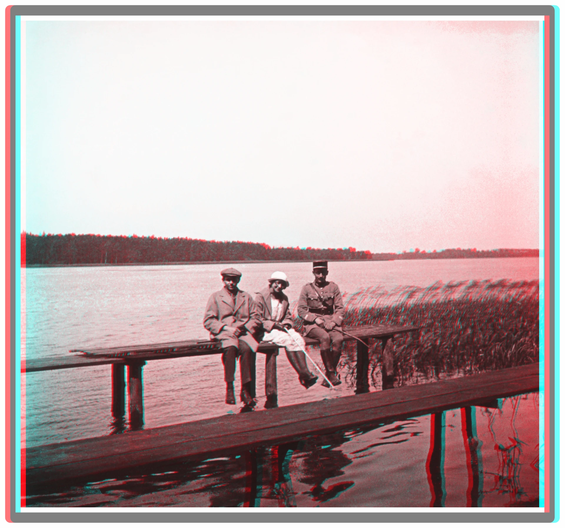 Okolice Tychów, sierpień 1921. Oficer francuski w towarzystwie młodej kobiety i młodego mężczyzny, siedzą na drewnianym pomoście nad jeziorem (najprawdopodobniej jeziorze Paprocańskim koło Tychów).