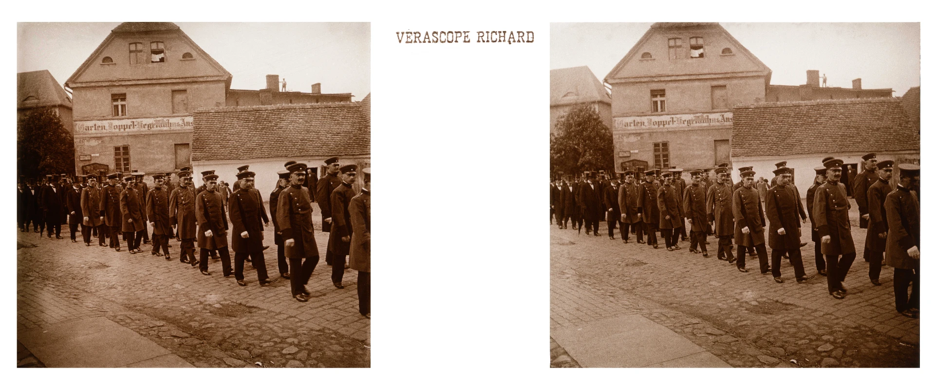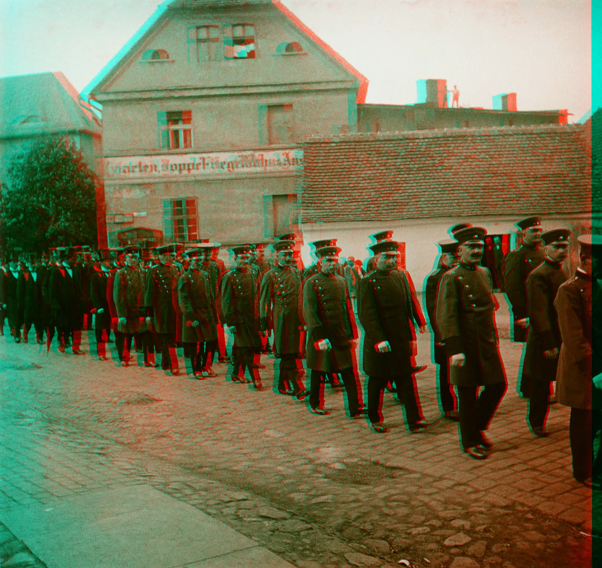 Na pierwszym planie widać niemieckich policjantów idących dwójkami za karawanem (widać go na innym slajdzie z tego wydarzenia).