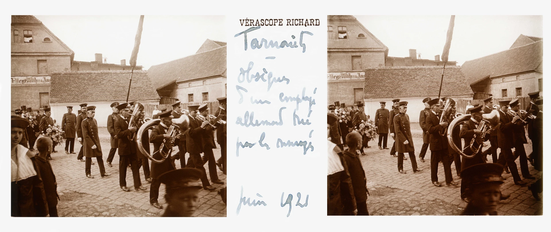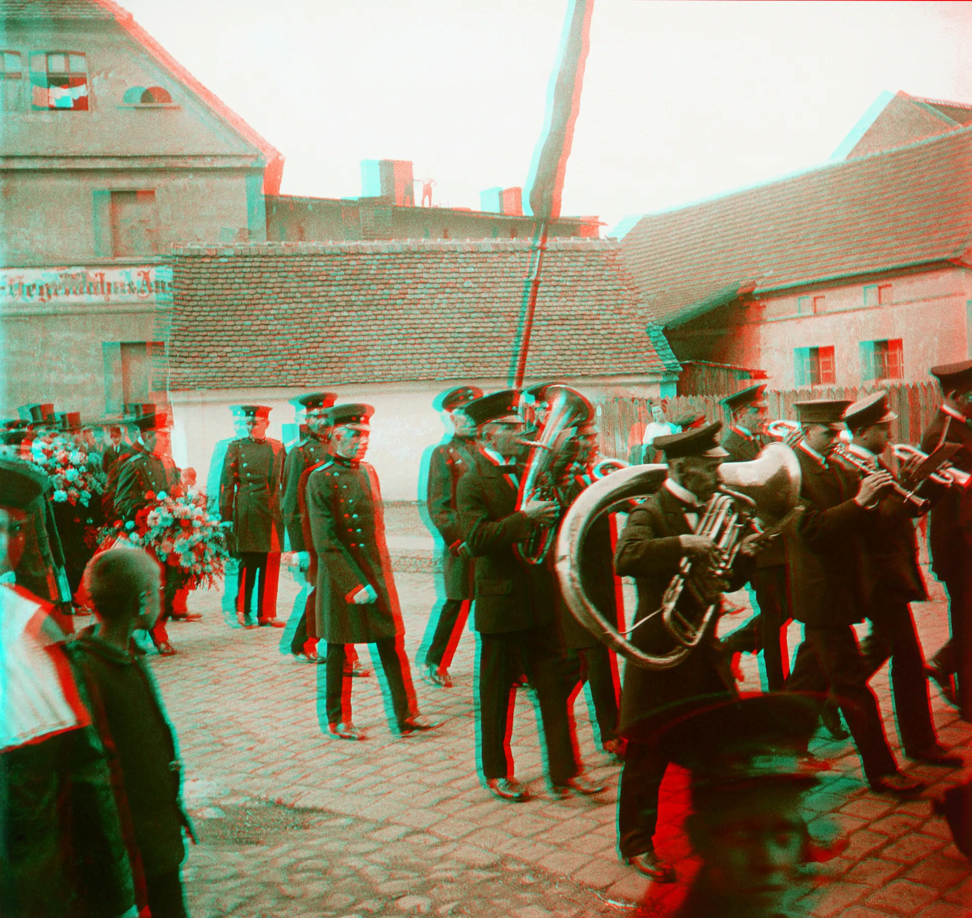 Na zdjęciu widać idącą w kondukcie orkiestrę z instrumentami dętymi. Dalej kilku mężczyzn w mundurach (niemiecka policja?), a za nimi odświętnie ubrani urzędnicy (?) z cylindrami na głowach, którzy niosą wieńce pogrzebowe. Z lewej strony konduktowi przypatruje się dwoje dzieci i kobieta.