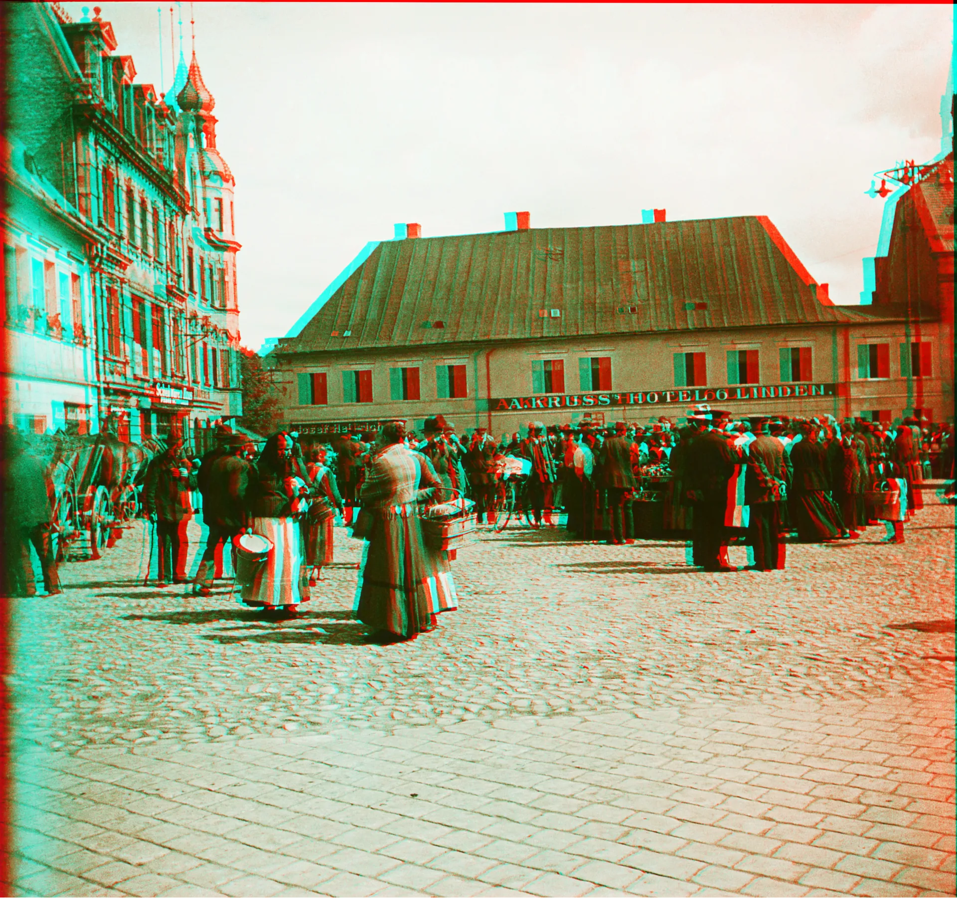 Na rynku widać oblegany przez klientów stragan (asortyment prawdopodobnie sezonowy warzywno-owocowy). Na pierwszym planie przodem do fotografa kobieta z wiadrem (czy nawet dwoma, jedno włożone w drugie?). Może sprzedawała mleko. Tyłem kobieta z koszem na ramieniu (handlująca?). Przed kamienicą pod numerem 16 stoi wóz z węglem (podobnie jak i dzisiaj w opał najlepiej zaopatrywać się już latem).