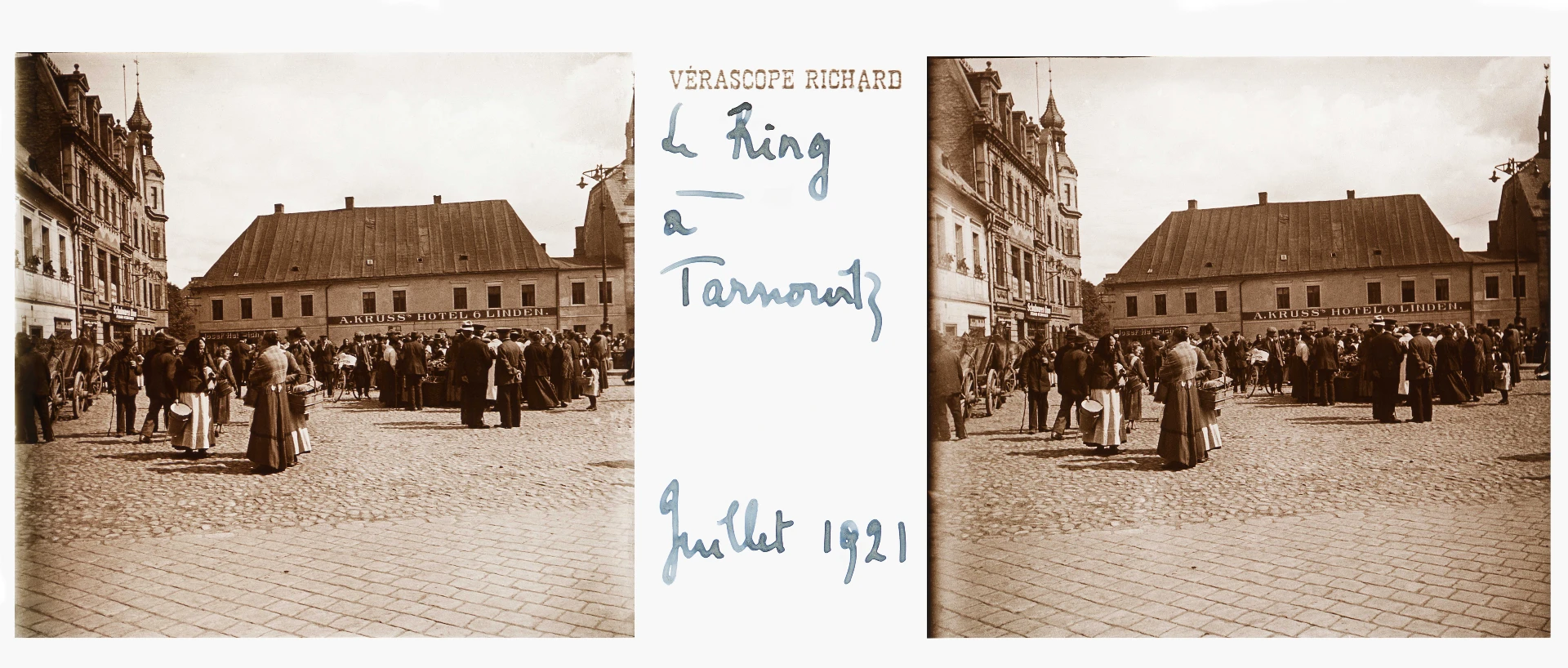 Widok rynku w Tarnowskich Górach. Fotograf znajdował się na wysokości XVI wiecznego domu podcieniowego pod numerem 17. Po lewej widoczna częściowo kamienica z numerem 16, za nią dom z numerem 15 (oba budynki po XIX-wiecznej przebudowie, choć pochodzące jeszcze z XVI wieku). W narożniku rynku charakterystyczna eklektyczna kamienica z numerem 14. Na wprost XVI-wieczna kamienica Bernharda (nazywana „domem pod sześcioma lipami”) – Rynek 13 z szyldem hotelu A. Krussa „6 Linden” („Pod sześcioma lipami”). Kamienica została później nieszczęśliwie nadbudowana o jedno piętro, tracąc swój piękny wysoki dach i stylowy charakter. Co ciekawe w czasach II Rzeczpospolitej na pamiątkę przyłączenia Tarnowskich Gór do Polski, na rynku zasadzono 3 dęby. Ale te długowieczne drzewa nie miały się tu „zestarzeć”. W czasach PRL-u podczas remontu nawierzchni rynku „sanacyjne” drzewa bezceremonialnie ścięto.