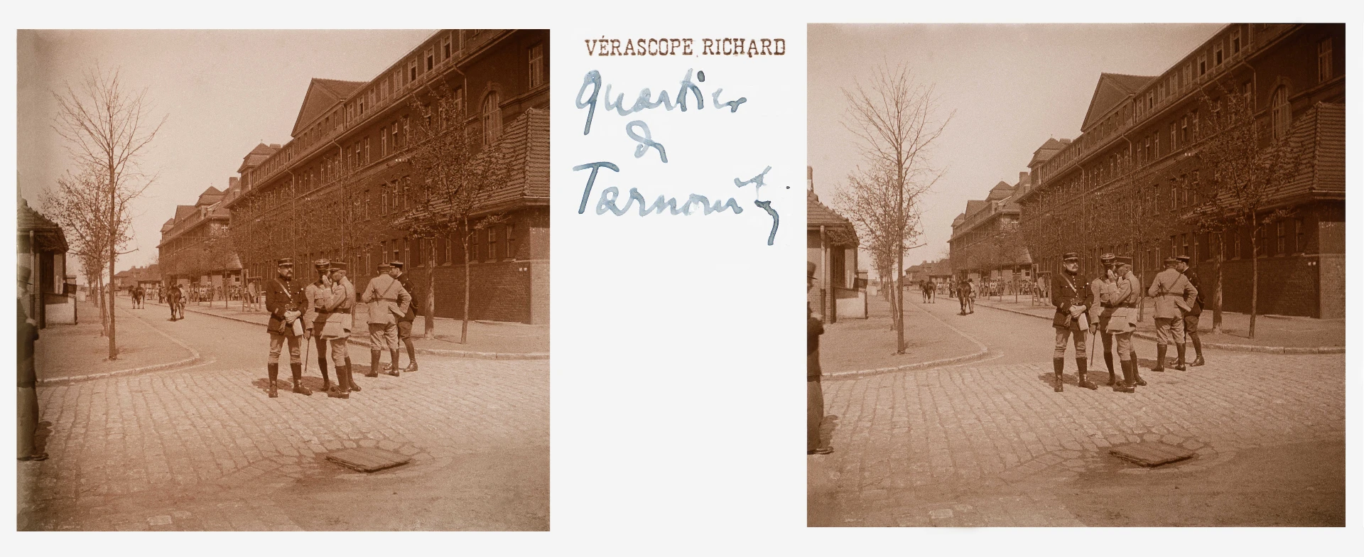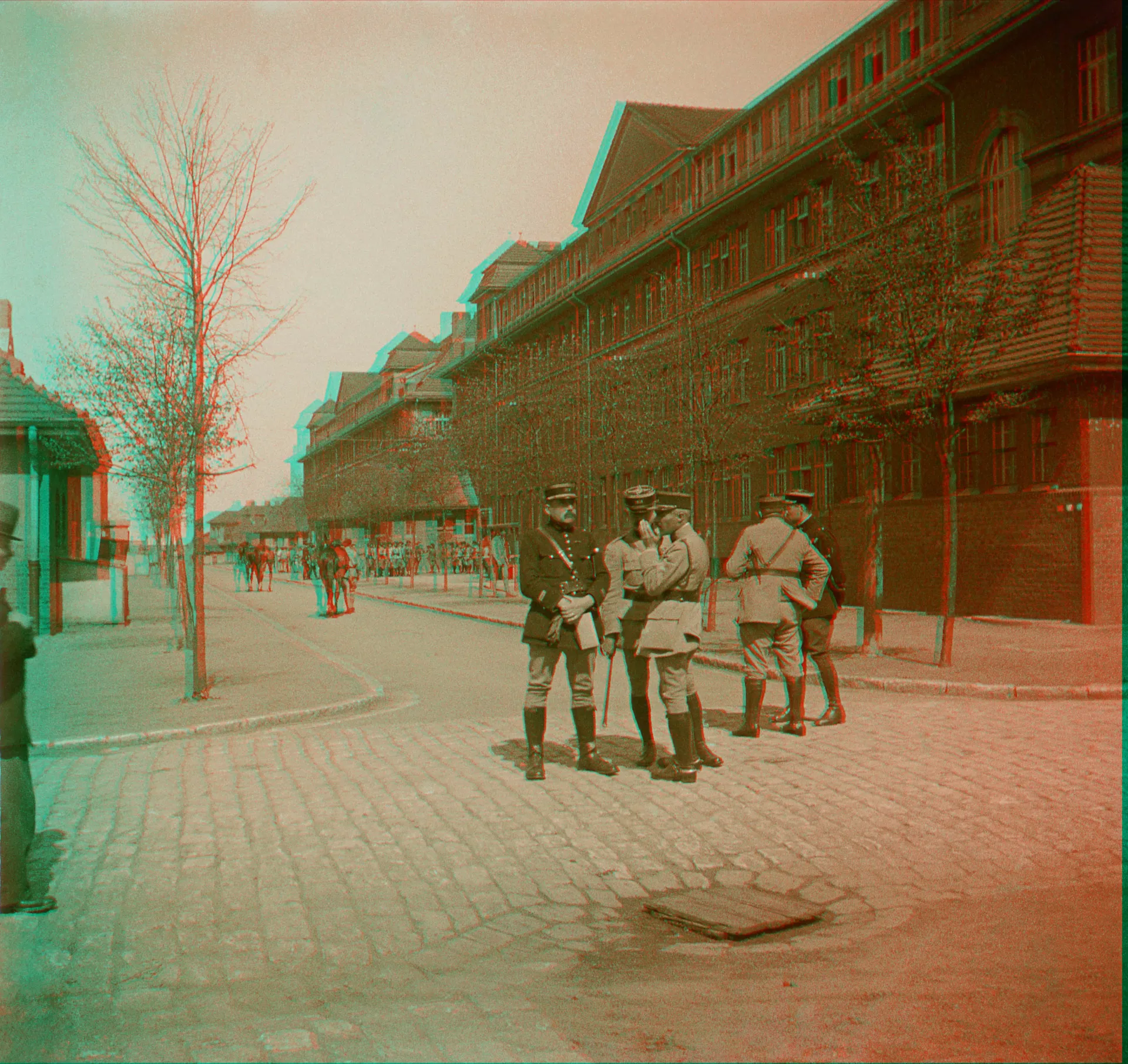 Tarnowskie Góry, prawdopodobnie marzec 1921. Wewnętrzna droga na terenie koszar przy dzisiejszej ulicy Opolskiej (wówczas Lublinitzerstrasse), w których stacjonowało francuskie wojsko. Przedtem koszary należały do pruskiego 11 Pułku Strzelców Konnych w Tarnowskich Górach. Z lewej strony na pierwszym planie stajnie, garaże (?). Z prawej strony wysokie budynki koszarowe. Na pierwszym planie grupa rozmawiających ze sobą francuskich oficerów. W oddali przy drugim z budynków koszarowych widać żołnierzy w beretach szaserów i żołnierzy prowadzących do stajni dwa konie. Być może przed chwilą zsiedli z nich dwaj rozmawiający na pierwszym planie oficerowie. Tym bardziej, że trzymają szpicruty.