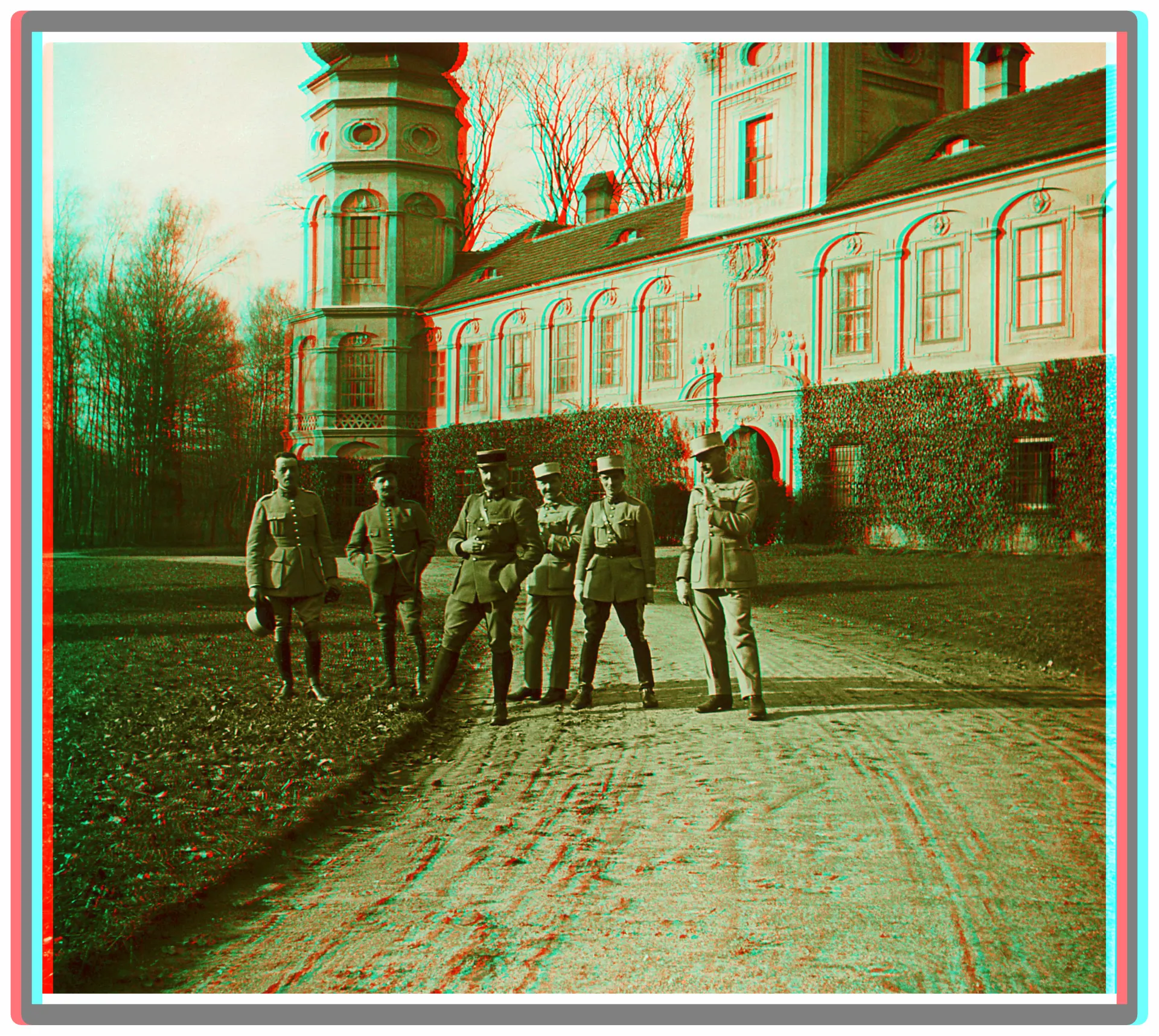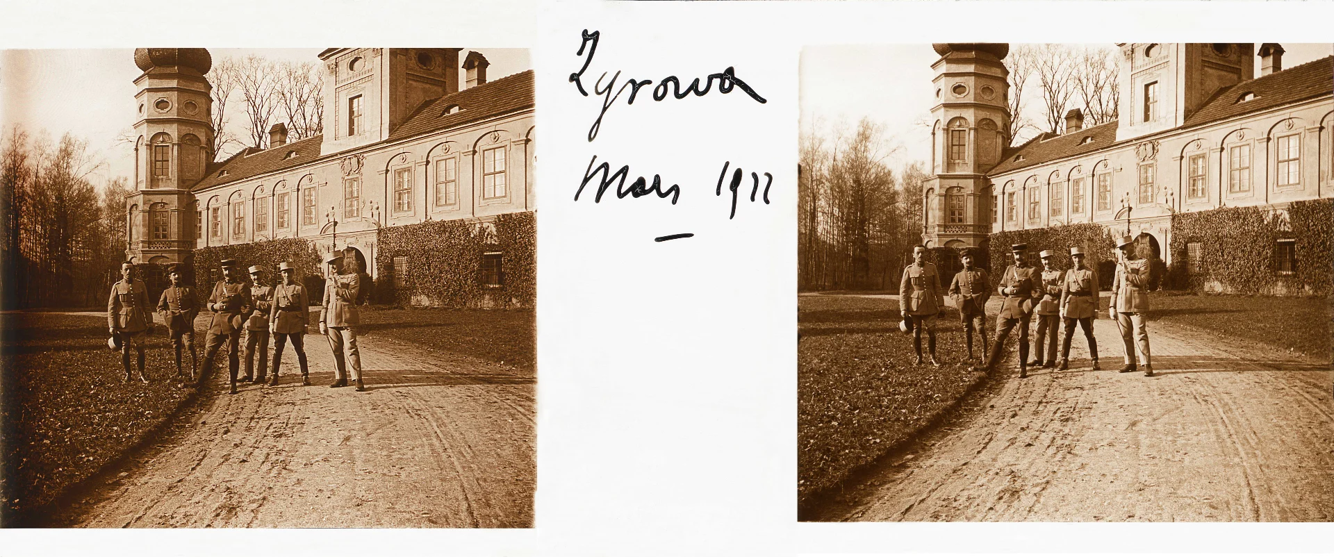 Wieś Żyrowa, marzec 1922. Przed pałacem rodziny Francken-Sierstorpff pozuje do zdjęcia grupa francuskich oficerów. Są to wojskowi, którzy pojawiają się także na innych slajdach wykonanych w Żyrowej i okolicy. Oficerowie stoją najprawdopodobniej w następującej kolejności. Pierwszy od prawej stoi porucznik Lair, dalej porucznik Grandchamps, trzeci porucznik Adjutor, obok niego major Renon, obok porucznik Noël i ostatni z lewej porucznik Vignes.