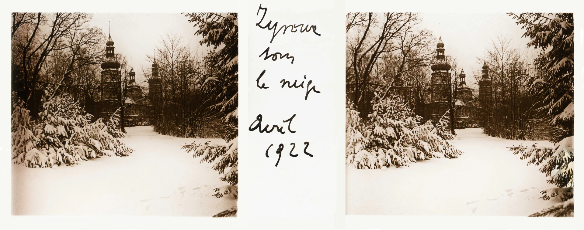 Zimowy widok pałacu w Żyrowej. Jak widać ludowe przysłowie o kapryśnym i nieobliczalnym pogodowo kwietniu jest jak najbardziej prawdziwe. I gdyby nie data na slajdzie można byłoby pomyśleć, że to raczej styczeń, czy luty. Dla niejednego francuskiego żołnierza przebywającego wiele miesięcy na Górnym Śląsku, musiała to być nieprzyjemna niespodzianka. W źródłach francuskich często wspomina się o licznych narzekaniach Francuzów na surowy klimat, do którego nie mogli się przyzwyczaić. Do tego dochodził chłód niemieckich budynków koszarowych (dla zwykłych żołnierzy), w których prawie zawsze było zimno i wilgotno.