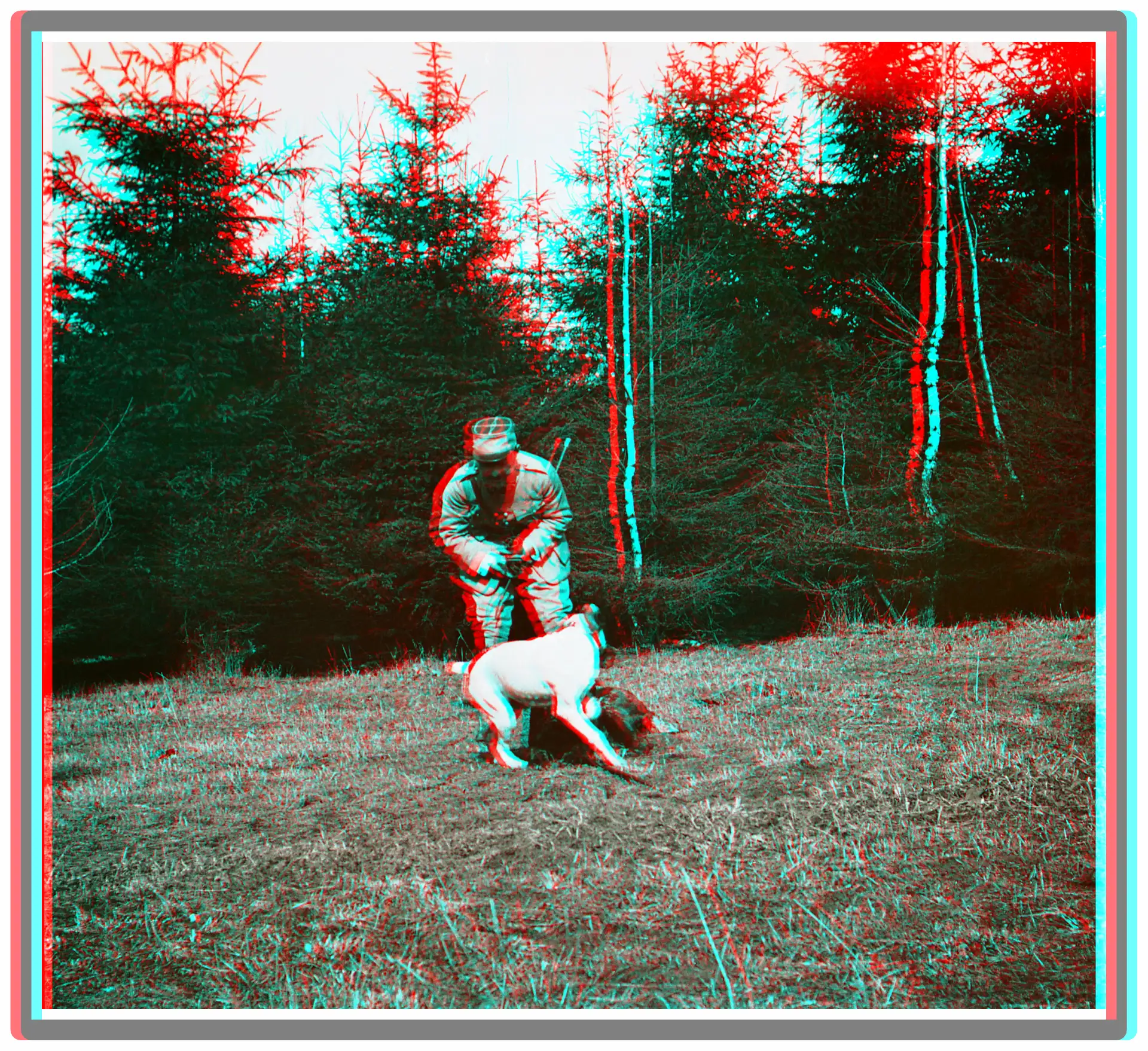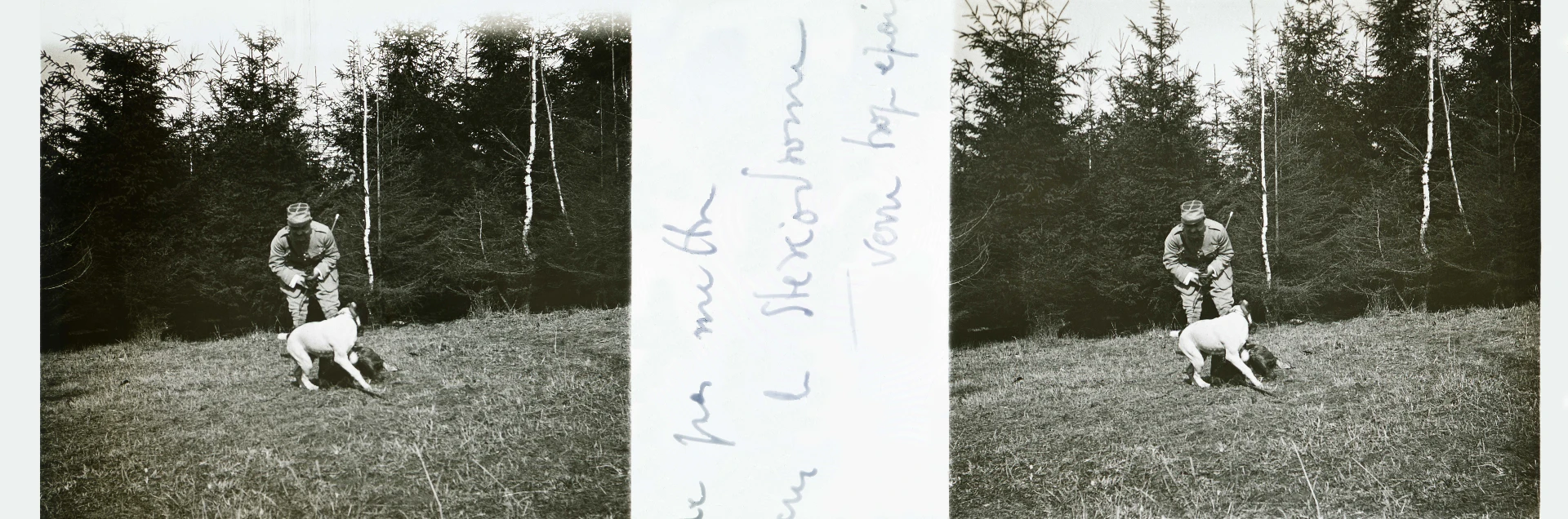 Najprawdopodobniej marzec 1922. Porucznik Adjutor ukazany na kolejnym slajdzie w czasie spaceru w przypałacowym parku z psami. Podobnie jak inne slajdy z tej „parkowej” serii słabo wykorzystuje możliwości fotografii stereoskopowej.