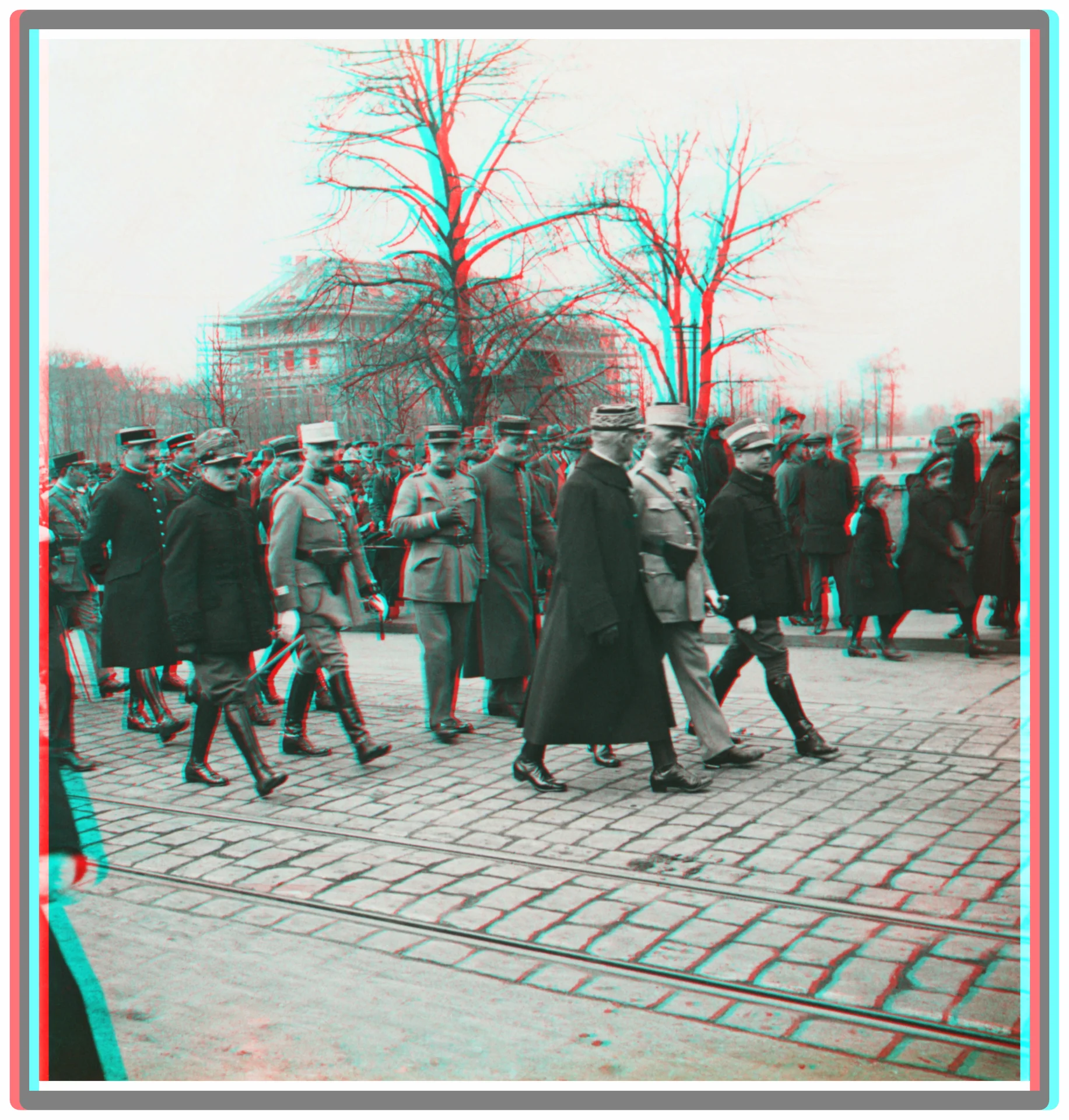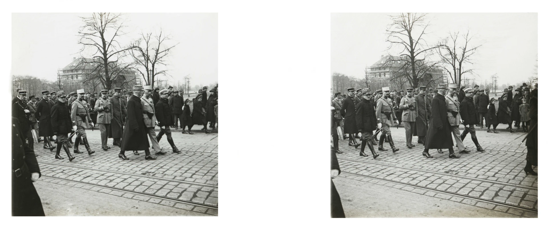 Na chodniku widok mieszkańców Gliwic, którzy obserwują kondukt. Wśród nich kobieta z dwiema małymi dziewczynkami (tu widać jedną z nich), która jest widoczna na innym zdjęciu wykonanym na mostku nad Kłodnicą (także prezentowanym w galerii). Ludzi obserwujących przejście francuskich oficerów jest jednak znacznie więcej niż na tamtym slajdzie.