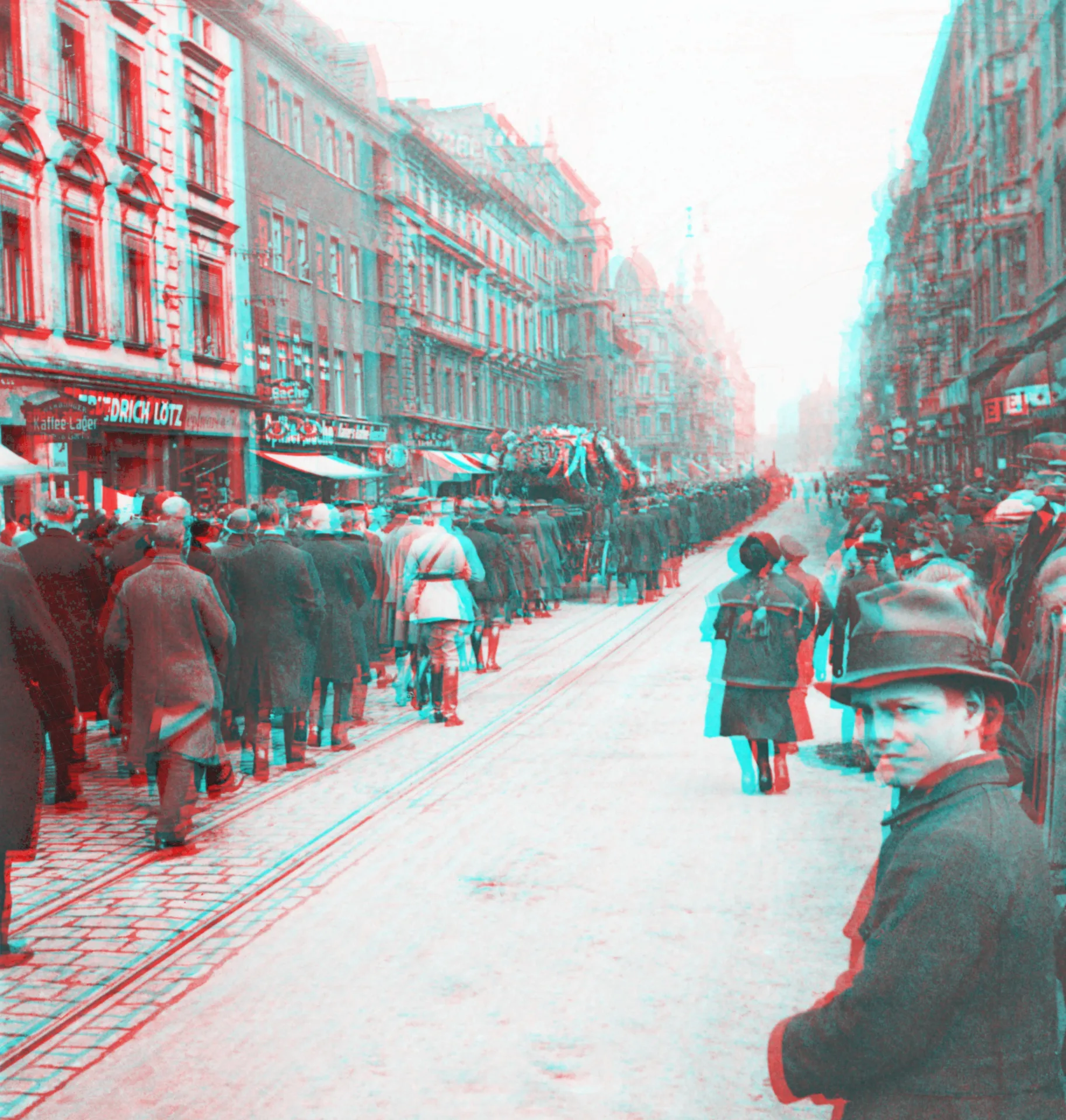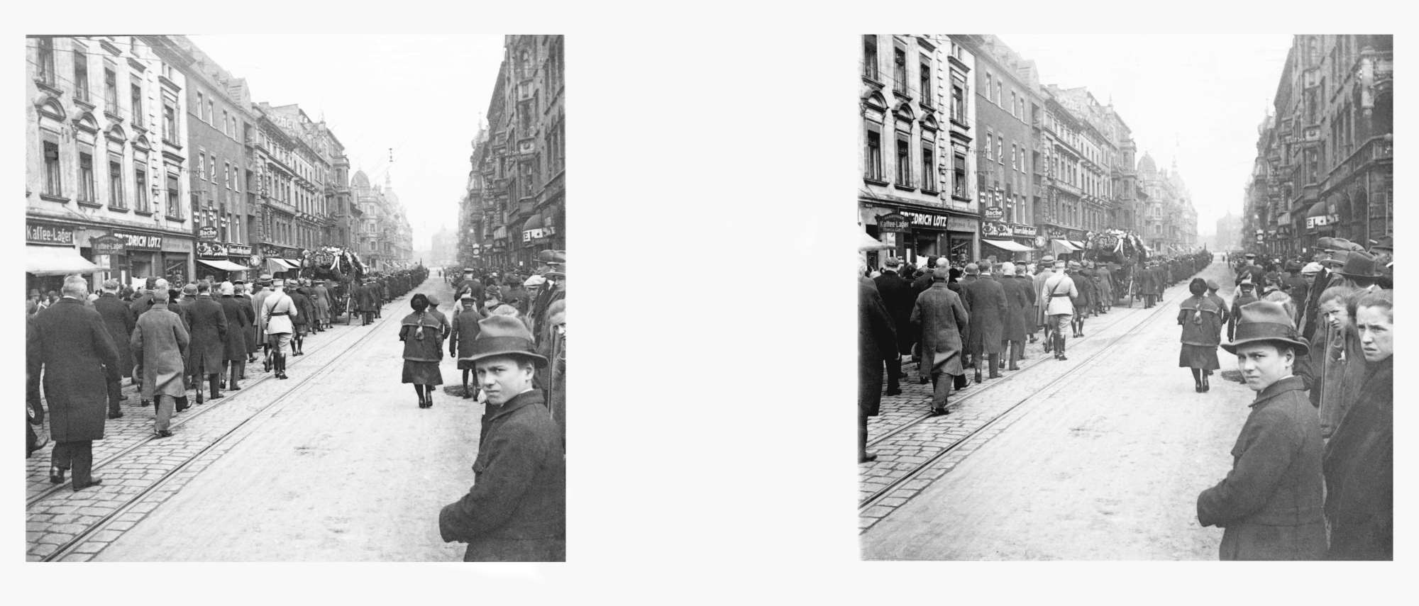Gliwice, 22 kwietnia 1922. Slajd przedstawia kondukt żałobny na ulicy Zwycięstwa (wówczas Wilhelmstrasse) zmierzający w stronę dworca kolejowego. W centralnej części slajdu widać karawan. Zdjęcie wykonano od strony mostka nad Kłodnicą, na wysokości dzisiejszych numerów 23 i 30. Po prawej słabo widoczny narożny budynek ówczesnego hotelu Schlesicher Hof (obecnie hotel Diament Plaza) Pod ozdobną markizą nad wejściem widać ostatnie dwie litery słowa „Hotel”. Po lewej stronie widok narożnej kamienicy, która mieściła m.in. fabrykę mebli Wilhelma Kutznera (W. Kutzner i Synowie). Kamienica została zburzona kilka lat później ok. 1928. W tym roku rozpoczęto bowiem budowę pięknego modernistycznego gmachu domu towarowego firmy DeFaKa (Deutsches Familien-Kaufhaus GmbH), który jako Powszechny Dom Towarowy „Ikar” działał po 1945, by po 2014 stać się biurowcem na wynajem.