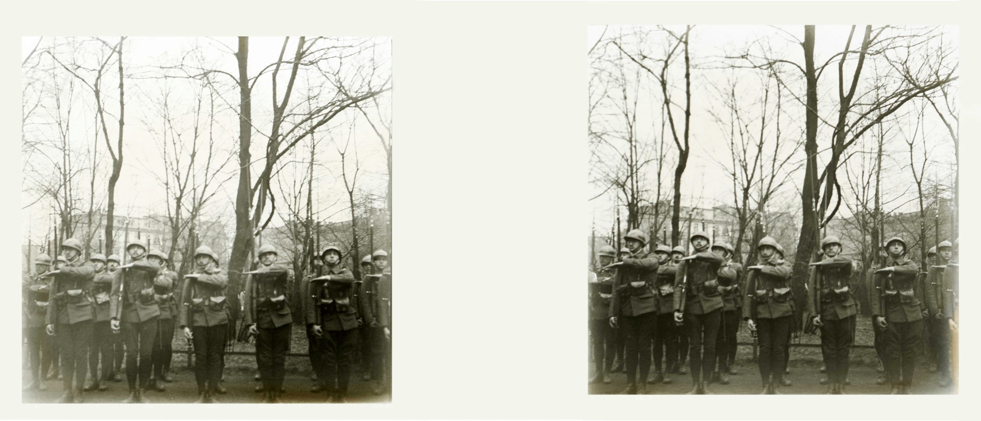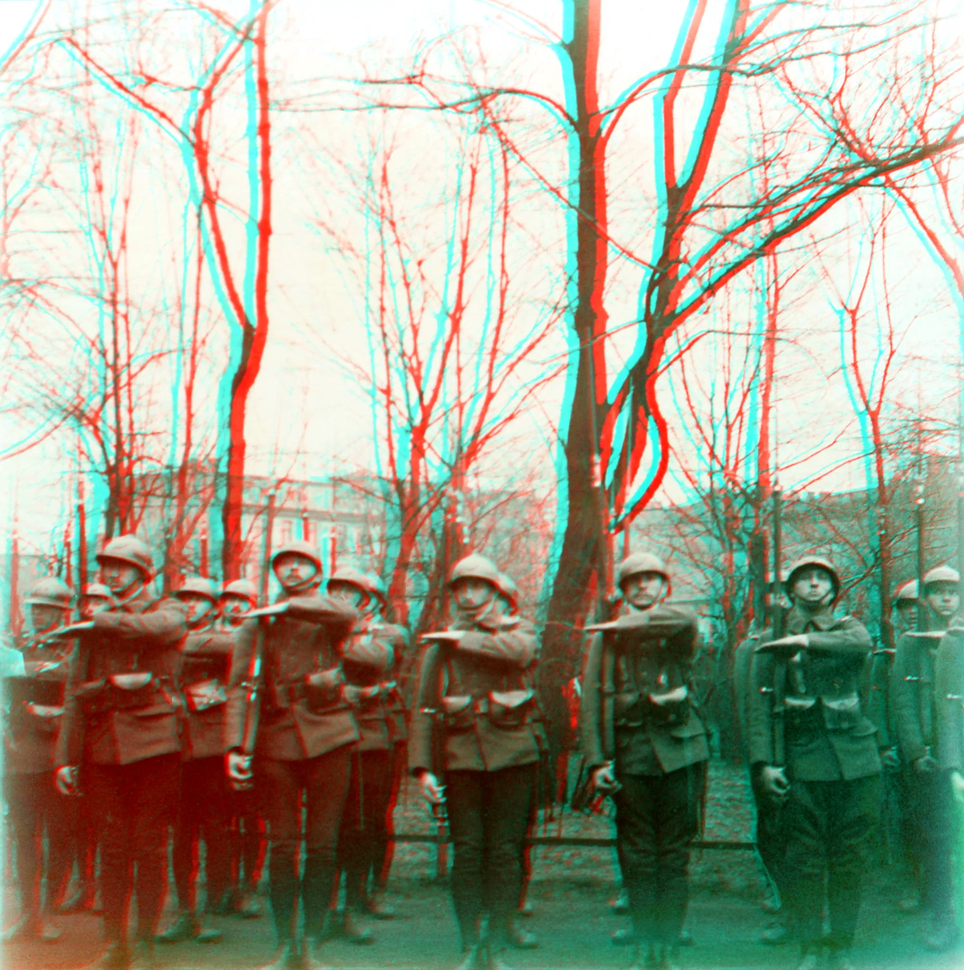 Gliwice, 11 kwietnia 1922. Stereoskopowa fotografia najprawdopodobniej przedstawia żołnierzy francuskich przed kościołem pw. Świętych Piotra i Pawła (obecnie katedra) w czasie pogrzebu poległych w zamachu na cmentarzu hutniczym. Na zdjęciu żołnierze stoją w postawie przejścia z „prezentuj broń” do postawy „na ramię broń”.