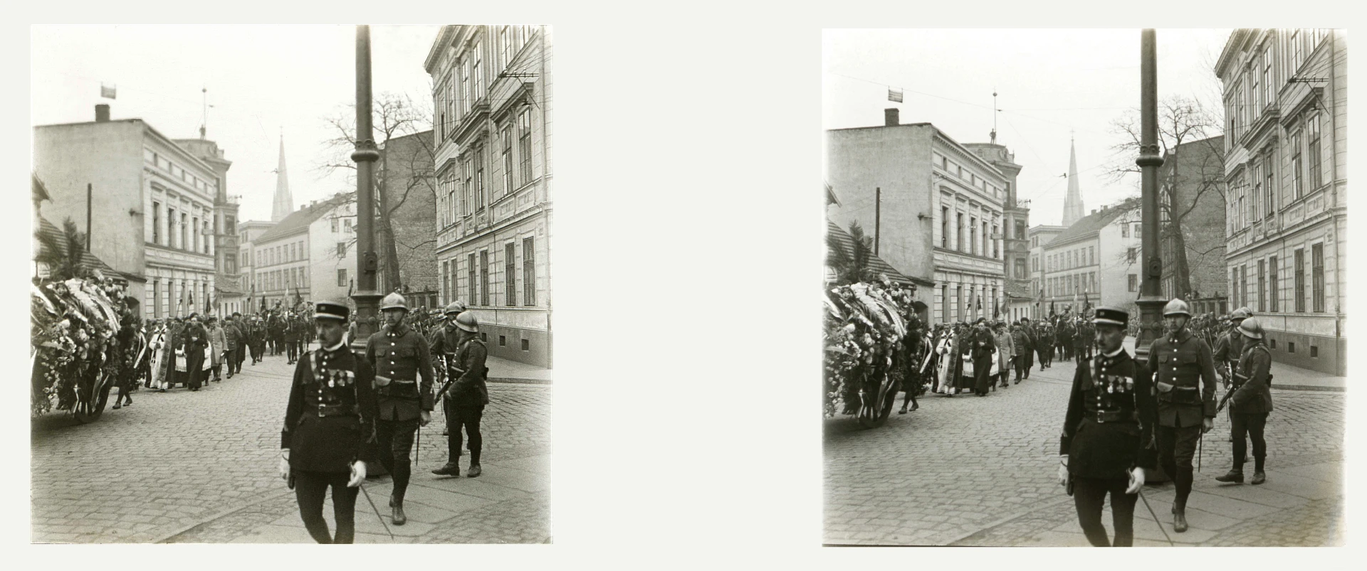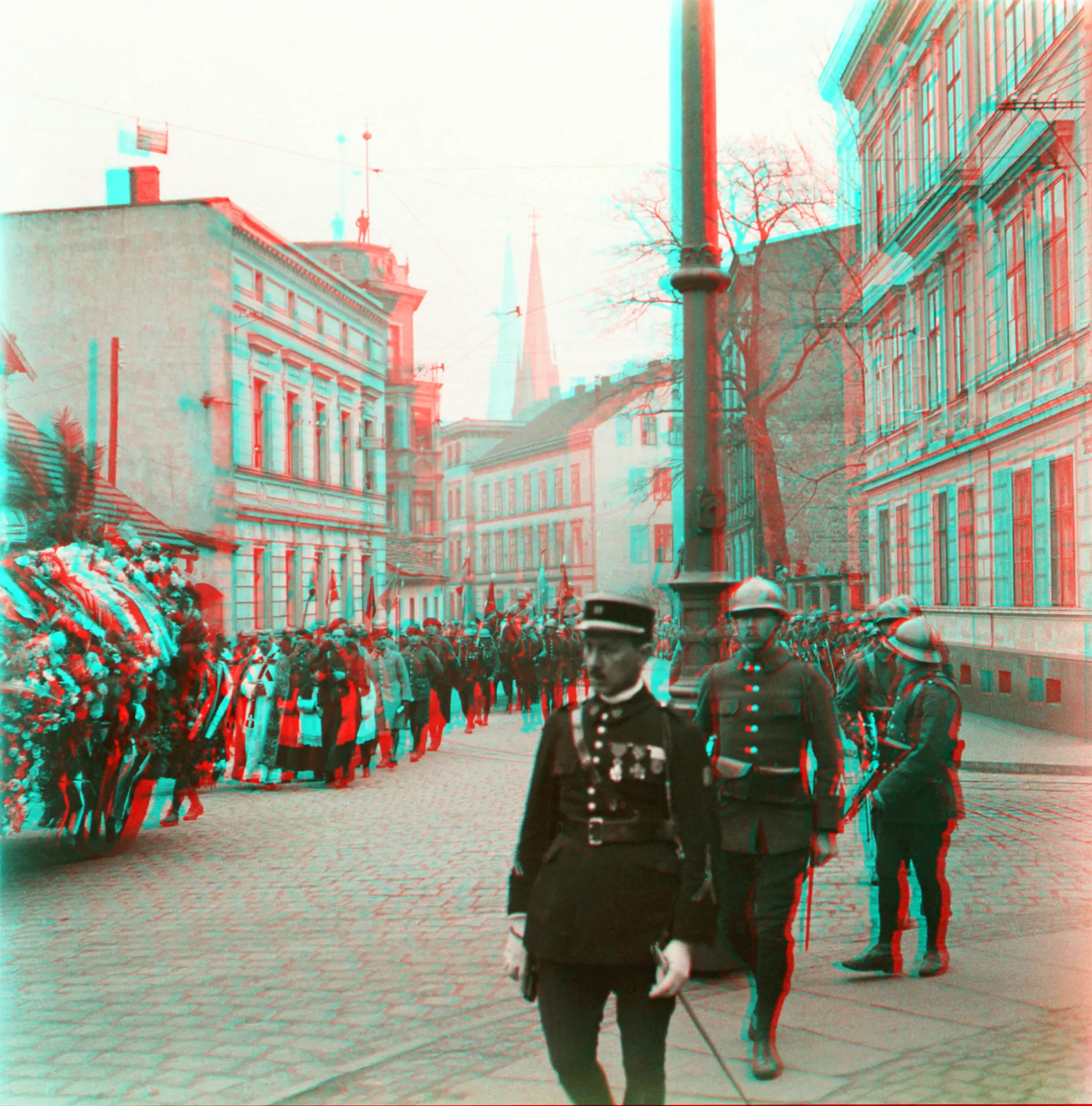 Za karawanem ozdobionym wieńcami pogrzebowymi widać księdza katolickiego i zapewne pastora protestanckiego. Kondukt ulicami Górnych Wałów, Ojca Jana Siemaszki (wówczas Klosterstrasse) i Kozielską (wówczas Coselerstrasse) zmierzał w kierunku cmentarza starokozielskiego. A w zasadzie na jego część wydzieloną na cmentarz francuski, na którym tymczasowo chowano poległych i zmarłych żołnierzy tej narodowości. Uroczyste otwarcie cmentarza francuskiego znajduje się na innej stereoskopowej fotografii w kolekcji. Pochowani tam Francuzi zostali „zabrani” do Francji przez opuszczający Górny Śląsk francuski kontyngent wojskowy.