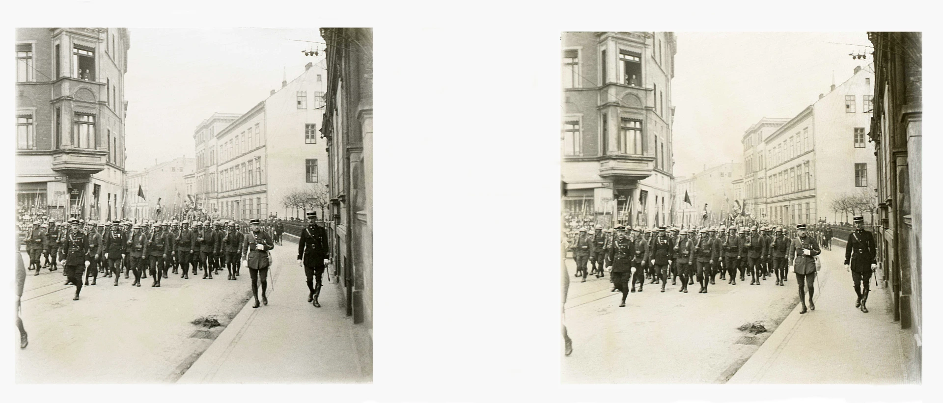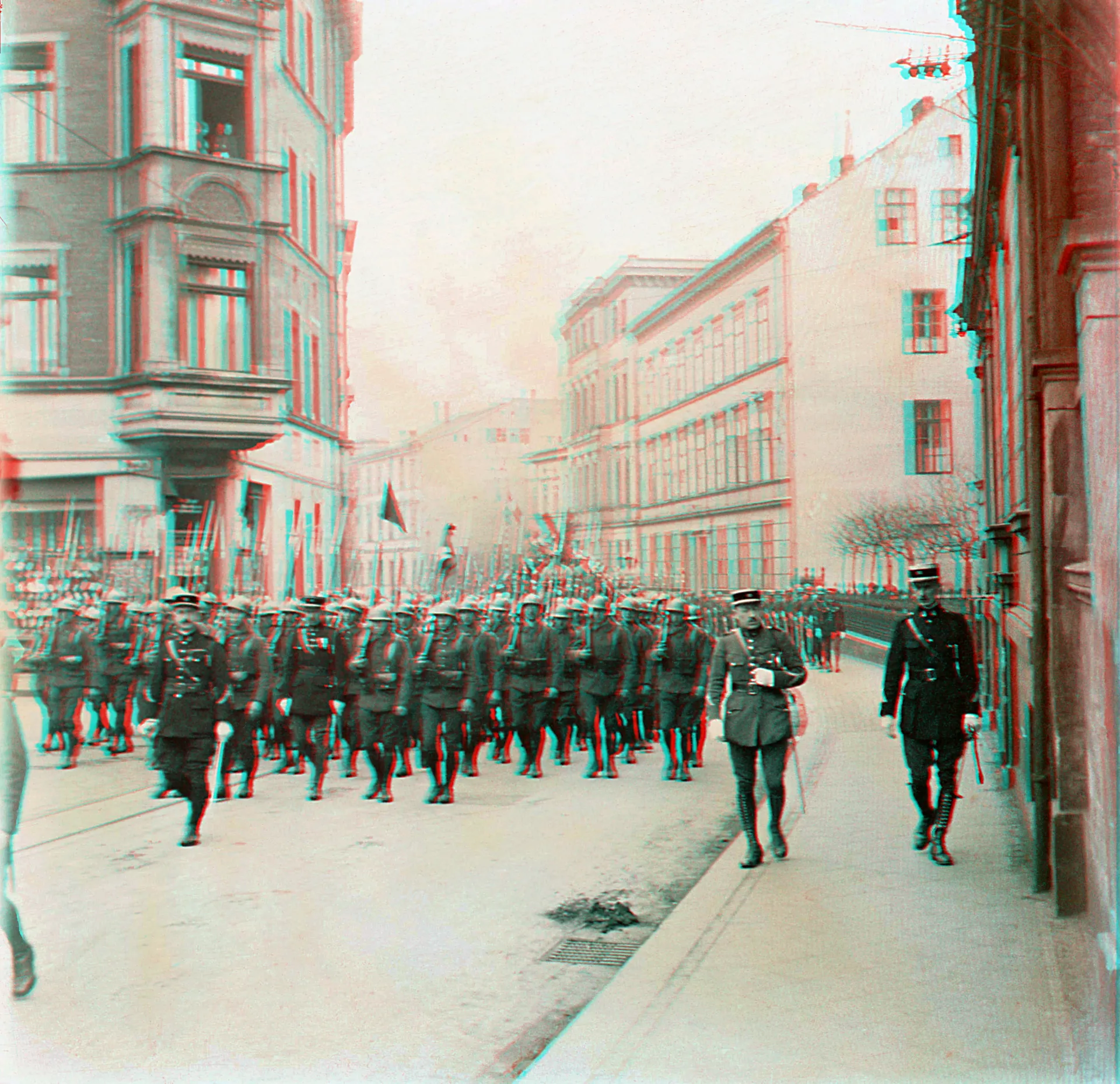 Kondukt pogrzebowy francuskich żołnierzy poległych w zamachu na cmentarzu hutniczym. Stereoskopową fotografię wykonano na ul. Górnych Wałów (wówczas Oberwallstrasse), z lewej widok wylotu ul. Krupniczej (wtedy Karlstrasse).