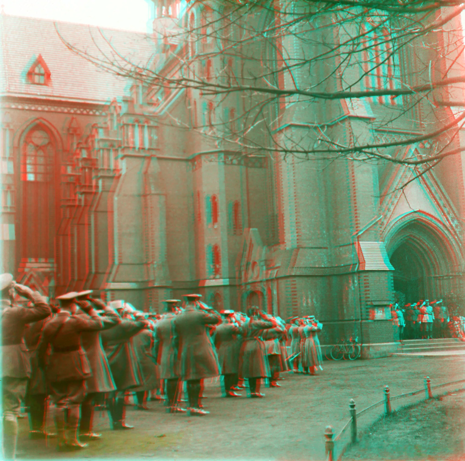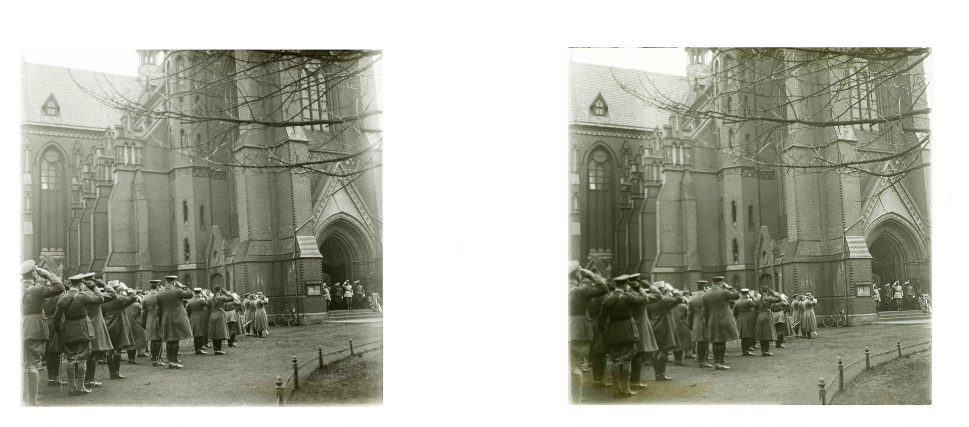 Gliwice, 11 kwietnia 1922. Stereoskopowa fotografia wykonana przed wejściem do kościoła pw. Świętych Piotra i Pawła w czasie pogrzebu poległych w zamachu na cmentarzu hutniczym.
