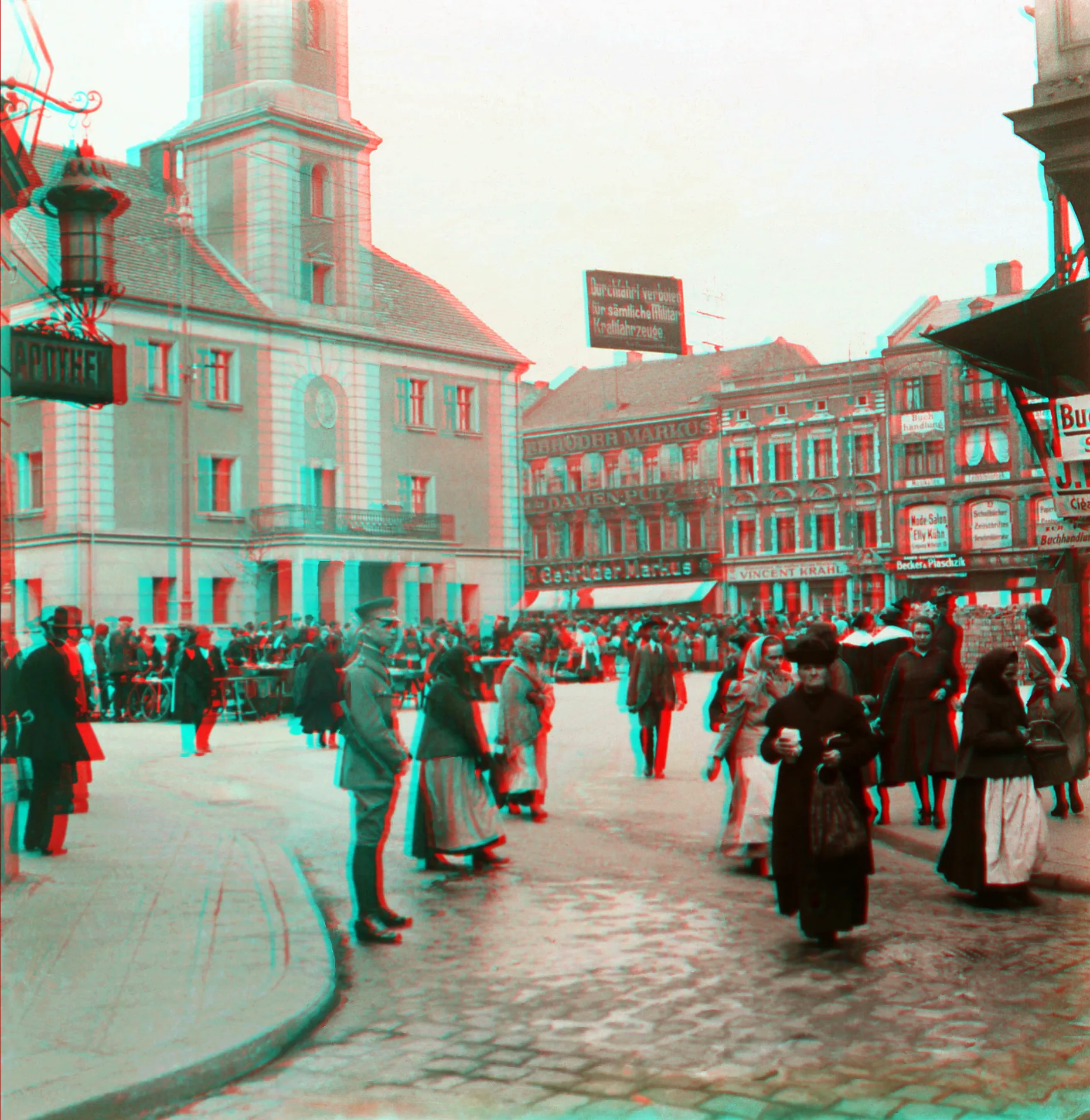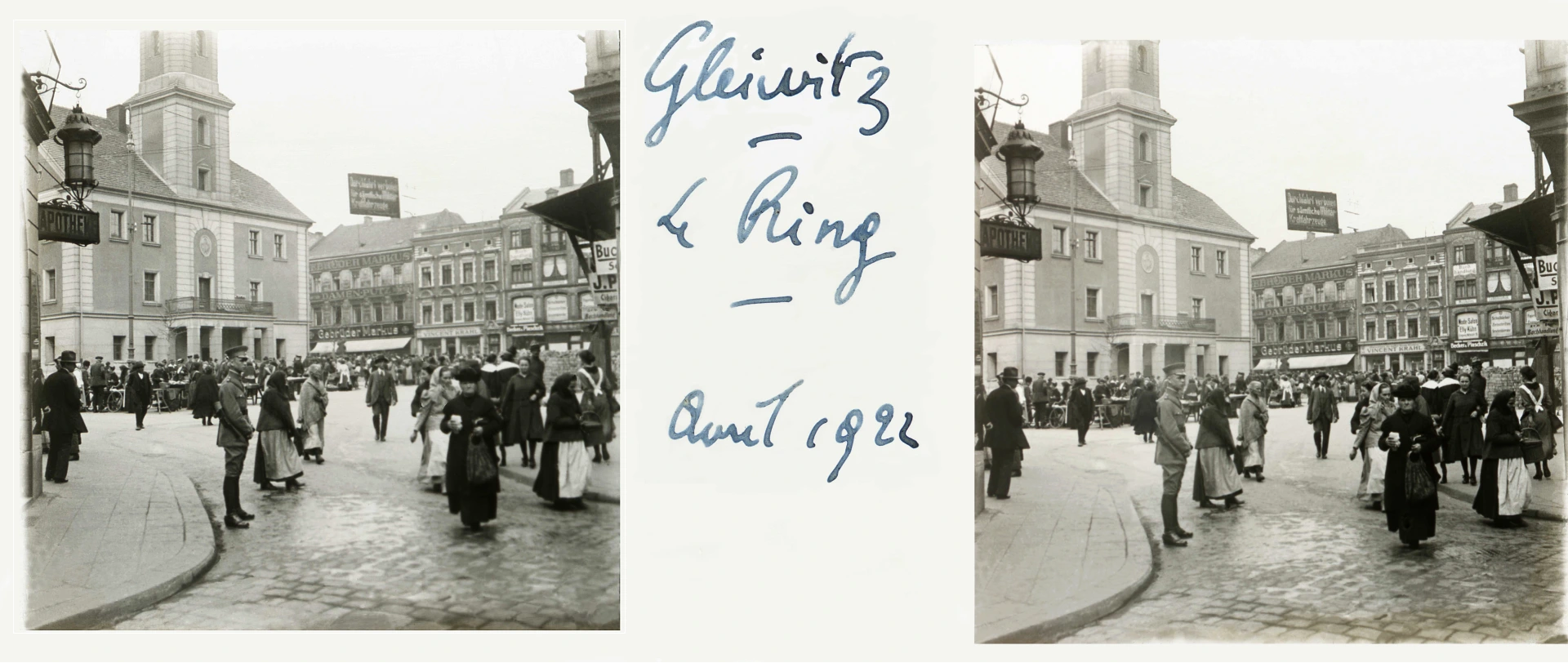 Kwiecień 1922. Stereoskopowe zdjęcie Rynku w Gliwicach wykonano od od strony wylotu ul. Jana Matejki (wówczas Tarnowitzerstrasse) i ul. Zwycięstwa (wtedy Wilhelmstrasse). Widok na ratusz i zachodnią pierzeję Rynku.