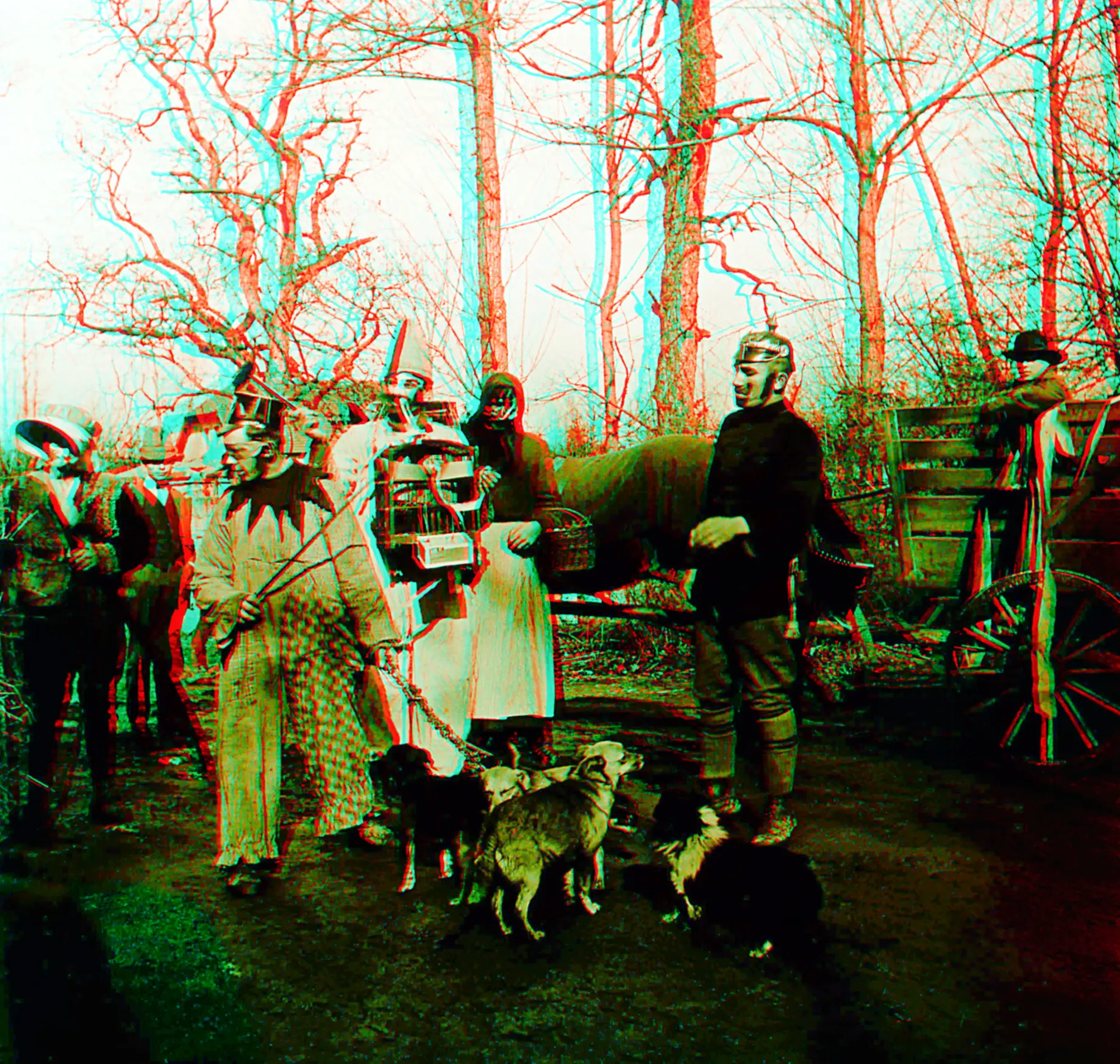 Zdjęcie ukazuje kilka tradycyjnych postaci „ostatkowego” korowodu. Z lewej strony fragment słomianego „przebrania” (prawie niewidocznego w kadrze) głównego bohatera Mardi Gras – „niedźwiedzia”. Obok niego stoi prowadzący misia „niedźwiednik” wspierający się na wysokim kiju. Kolejna postać to komicznie ubrany „hycel” z gromadką psów, które trzyma na słomianym powróśle. Lekko za nim, po prawej postać „lekarza – aptekarza”. „Doktor” ma wysoką spiczastą czapkę, przed sobą trzyma klatkę, do której przymocowano pudełko na zwyczajowe datki. Obok „lekarza” stoi „baba” (zgodnie z tradycją „odgrywa” go zapewne przebrany mężczyzna). „Baba” trzyma koszyk, do którego pewnie wkładano jajka otrzymywane od odwiedzanych po drodze włościan.