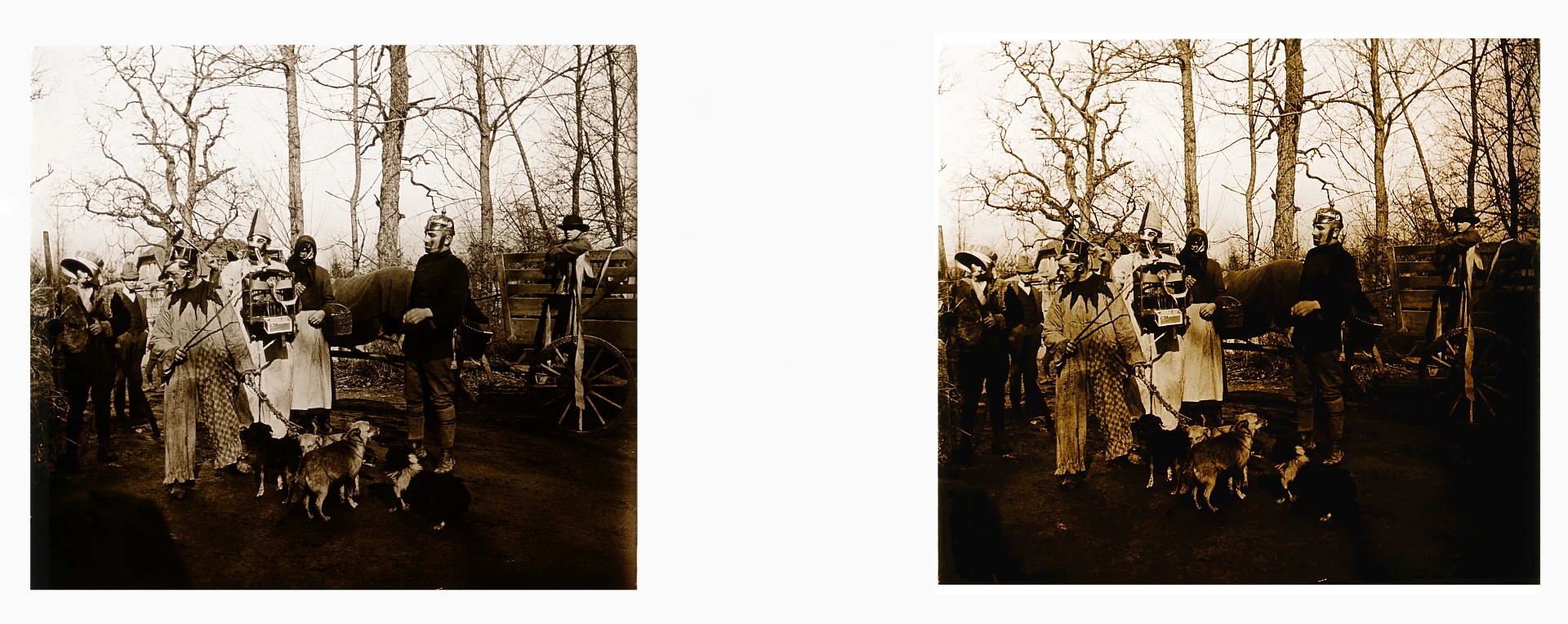 Lekko oddalony od nich po prawej „policjant – strażak” w ciekawym hełmie. To pruska pikielhauba (niem. Pickelhaube), skórzany hełm z charakterystycznym spiczastym zakończeniem. Ten typ hełmu wyszedł z użycia wojskowego wraz z upadkiem Cesarstwa Niemieckiego w 1918. Jak widać w 1922 roku był już tylko komicznym gadżetem przebierańców. Ostatnim elementem kadru na prawo od wesołej gromadki jest konny wóz, którego woźnica ciekawie zerka na fotografa. To samo robi jeszcze jeden postronny świadek stojący między „niedźwiednikiem” a „hyclem”.