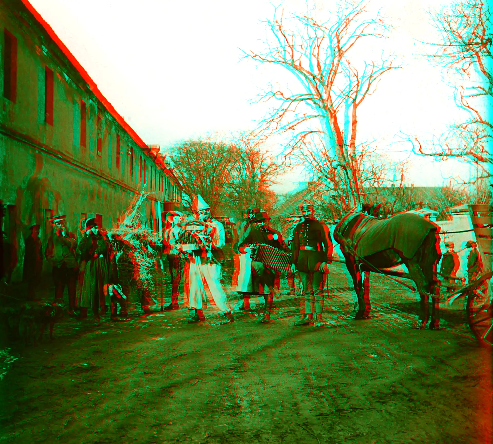 Na tej stereoskopowej fotografii można znaleźć tradycyjne postacie. Najważniejsza z nich to oczywiście „niedźwiedź”. „Niedźwiedź” owinięty jest plecionymi w warkocze słomianymi powrósłami, na głowie ma spiczastą czapką (także ze słomy) zwieńczoną dzwoneczkiem (czapkę taką nazywano koroną). Misia prowadzi na słomianym powróśle „niedźwiednik” (stoi za misiem trzymając wysoki kij). W żyrowskim korowodzie widać także „babę” (zgodnie z tradycją jest to przebrany mężczyzna), „policjanta” (lub „strażaka”) z charakterystycznym pruskim hełmem – pikielhaubą, „harmonistę”, „cygankę”, ubraną na biało (raczej na jasno) postać „lekarza”, lub „aptekarza”, który ma na głowie spiczastą czapkę, a na piersi zawieszoną klatkę z pudełkiem na zwyczajowe datki. Ale np. w powiecie gliwickim to zazwyczaj „baba” zajmowała się zbieraniem datków.